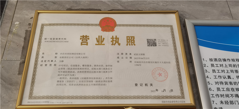 许昌市美际酒店有限公司成立于2025年04月22日,注册地位于河南省许昌市建安区瑞贝卡大道东段1396号,法定代表人为文静。经营范围包括许可项目:住宿服务;餐饮服务;酒类经营;烟草制品零售(依法须经批准的项目,经相关部门批准后方可开展经营活动,具体经营项目以相关部门批准文件或许可证件为准)一般项目:
